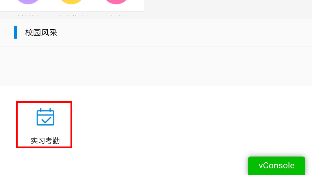 +6. 打开以下链接重新进入考勤页面,并进入实习考勤,此时页面右下角出现vConsole图标