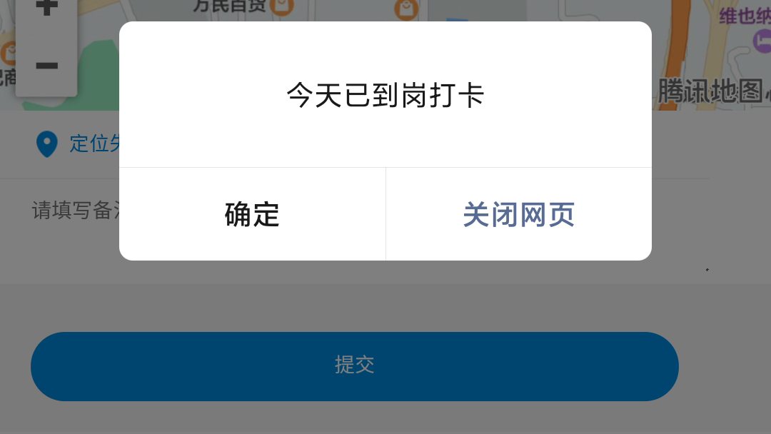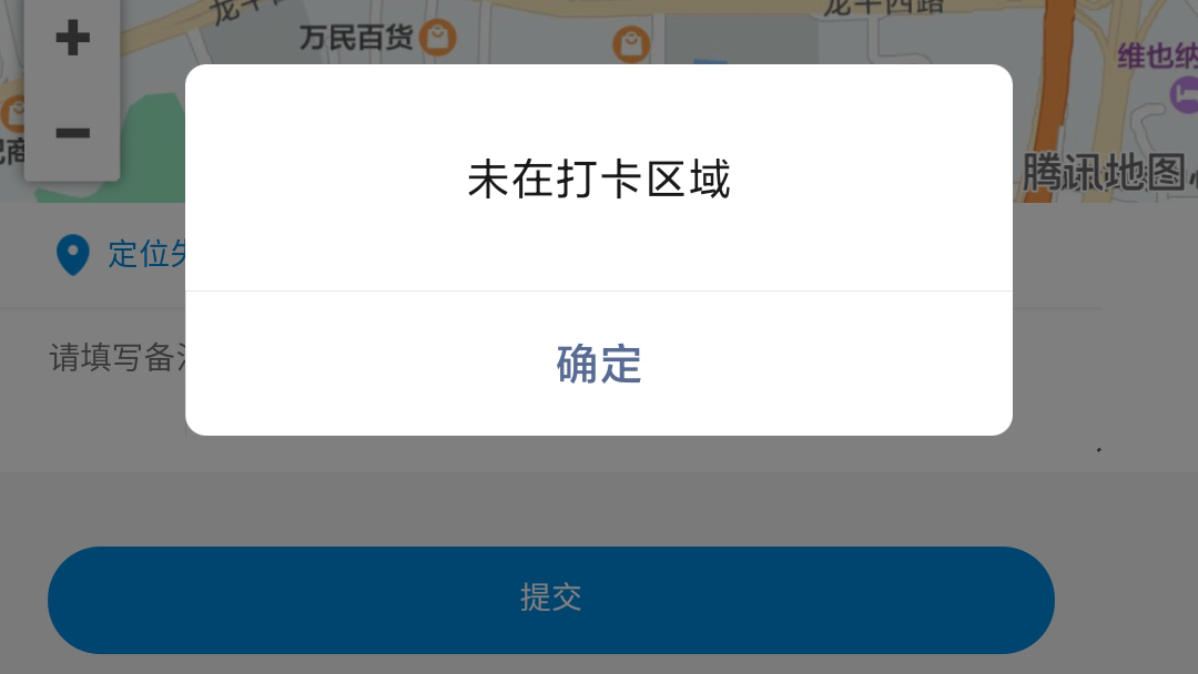 +10. 再次提交打卡,可以看到没有提示“未在打卡区域”
